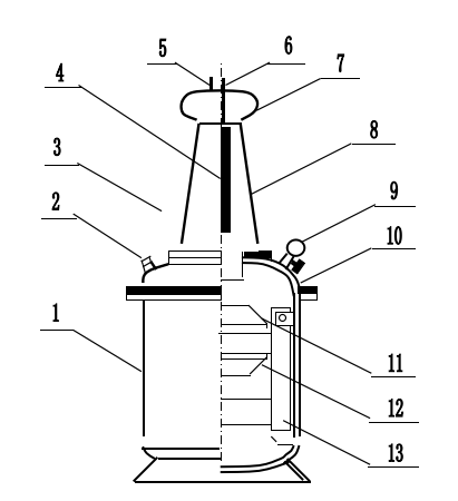 氣體式試驗(yàn)變壓器采用單框芯式鐵芯結(jié)構(gòu),初級(jí)繞組繞在鐵芯上,高壓繞組在外,這種同軸布置減少了漏磁通,因而增大了繞組間的耦合。產(chǎn)品的外殼為圓柱灌式容器結(jié)構(gòu),能耐受0.8MPa以上壓力。其結(jié)構(gòu)見(jiàn)下圖: