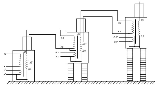圖4:交直流氣體式試驗(yàn)變壓器接線 圖中:D – 短路桿 VD – 高壓硅堆 4. 串級(jí)氣體式試驗(yàn)變壓器接線及原理:如圖5 串級(jí)氣體式試驗(yàn)變壓器有很大的優(yōu)越性,三臺(tái)試驗(yàn)變壓器串級(jí)連接可獲得更高的電壓,因?yàn)檎麄€(gè)試驗(yàn)裝置由幾臺(tái)單臺(tái)試驗(yàn)變壓器組成,單臺(tái)試驗(yàn)變壓器容量小、電壓低、重量輕,便于運(yùn)輸和安裝。它既然可串接成高出幾倍的單臺(tái)試驗(yàn)變壓器輸出電壓組合使用,又可分開(kāi)成幾套單臺(tái)試驗(yàn)變壓器單獨(dú)使用。整套裝置投資小,經(jīng)濟(jì)實(shí)惠。圖5中,在第一級(jí)和第二級(jí)的每個(gè)單元試驗(yàn)變壓器中都有一個(gè)勵(lì)磁繞組A1、C1和A2、C2。在串級(jí)試驗(yàn)變器基本原理圖中,低壓電源加在試驗(yàn)變壓器I的初級(jí)繞組a1x1上,單臺(tái)試驗(yàn)變壓Ⅰ、Ⅱ、Ⅲ的輸出電壓都是V。勵(lì)磁繞組A1、C1給第二級(jí)試驗(yàn)變壓器Ⅱ的初級(jí)繞組供電;第二級(jí)試驗(yàn)變壓器Ⅱ的勵(lì)磁繞組A2、C2給第三級(jí)試驗(yàn)變壓器Ⅲ的初級(jí)繞組供電。第二級(jí)試驗(yàn)變壓器Ⅱ和第三級(jí)試驗(yàn)變壓器Ⅲ的箱體分別處在對(duì)地為1V和2V的高電位上,所以箱體對(duì)地是絕緣的,試驗(yàn)變壓器I的箱體是接地的。這樣第一級(jí)、第二級(jí)、第三試驗(yàn)變壓器對(duì)地的額定輸出電壓分別為1V、2V、3V;其額定容量分別為3P、2P、1P。