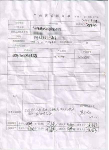 2014-06-03 廣州藍鱒電子科技有限公司進行調試服務,調試產品:CYYT-5/10無局部放電試驗成套裝置