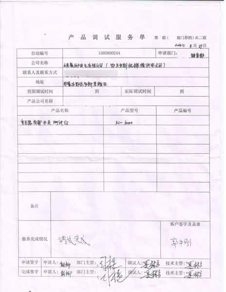 2014-08-30  山東豪酈電氣有限公司進(jìn)行調(diào)試服務(wù),調(diào)試產(chǎn)品:CYKC-6000變壓器有載開(kāi)關(guān)測(cè)試儀(實(shí)際是CYKC-5000變壓器有載開(kāi)關(guān)測(cè)試儀)