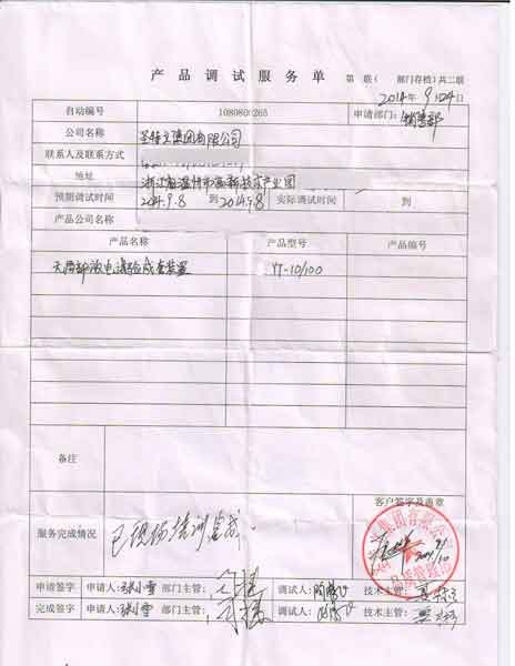 2014-10-09  浙江圣特立電氣有限公司進行調試服務,調試產品:CYYT-10/100無局部放電試驗成套裝置  CYYT-10/100、無局部放電試驗成套裝置1070420201