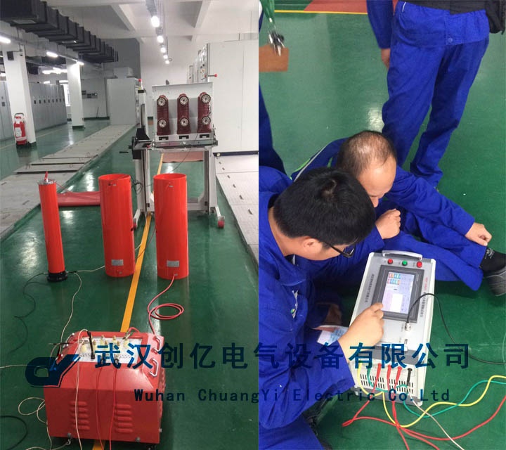 我司技術人員抵達客戶處后,首先進行試驗內容和工作原理的講解,然后進行現場試驗。先斷開高壓開關電源,斷開高壓開關電源,抽出高開本體就位,保留足夠安全距離,被試品可靠接地;配合被試品規格,計算出試驗電壓電流、被試品電容和電抗器容量、大概諧振頻率,繼而推算電抗器的使用節數和接線方式,本試驗采用4節電抗器串聯接線,變頻電源電壓檔3KV;進行試驗,在試驗過程中,指導客戶操作并對每個界面進行講解,最后強調注意事項。