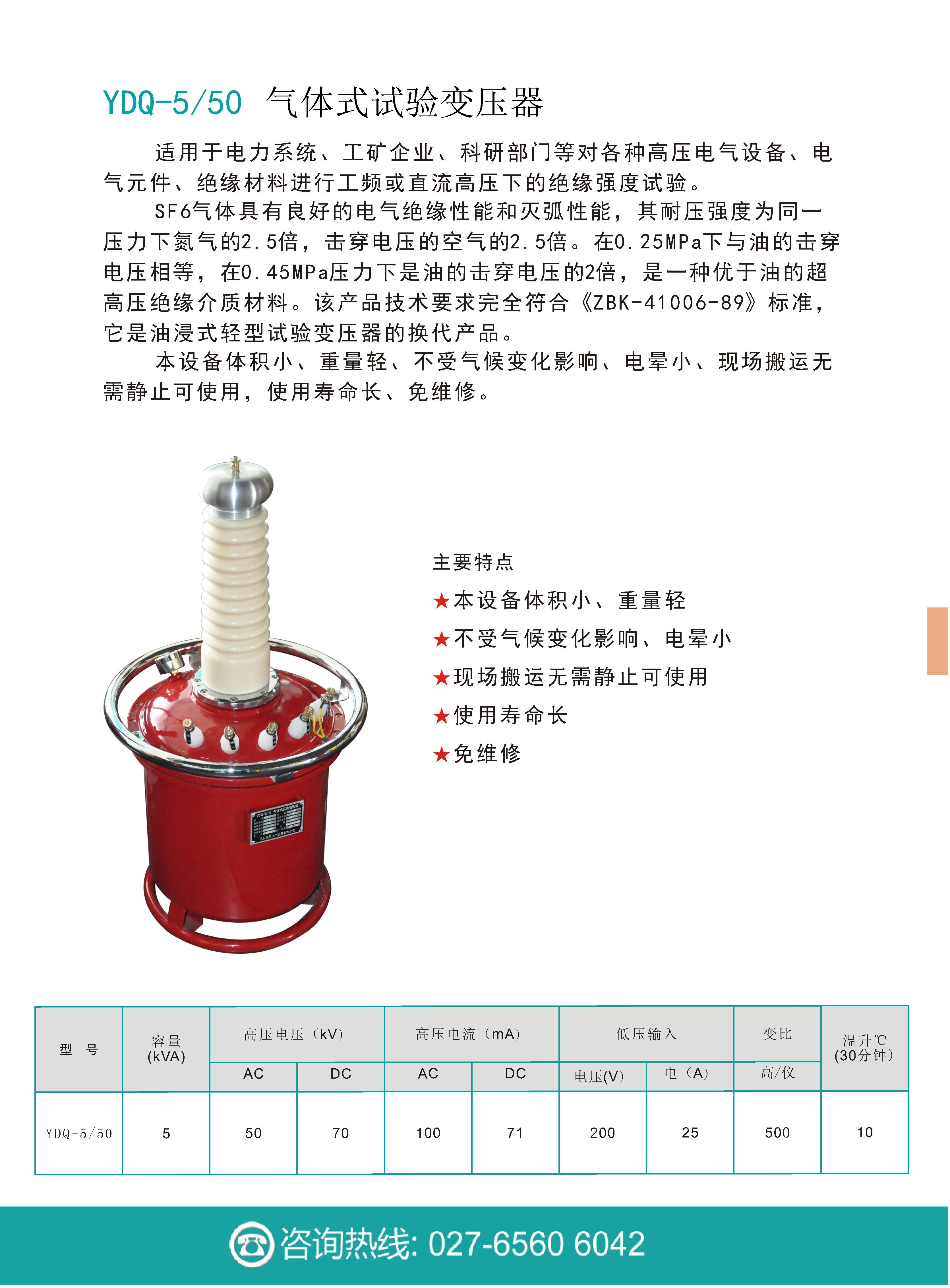 YDQ-5/50氣體式試驗(yàn)變壓器是根據(jù)《試驗(yàn)變壓器》標(biāo)準(zhǔn),在油浸式試驗(yàn)變壓器的基礎(chǔ)上而設(shè)計(jì)生產(chǎn)的。SF6氣體具有良好的電氣絕緣性能及優(yōu)異的滅弧性能,其耐壓強(qiáng)度為同一壓力下氮?dú)獾?.5倍,擊穿電壓的空氣的2.5倍。在0.25MPa下與油的擊穿電壓相等,在0.45MPa壓力下是油的擊穿電壓的2倍,是一種優(yōu)于油的新一代超高壓絕緣介質(zhì)材料。該產(chǎn)品技術(shù)要求完全符合《ZBK-41006-89》標(biāo)準(zhǔn),它是油浸式輕型試驗(yàn)變壓器的換代產(chǎn)品。該產(chǎn)品具有體積小、重量輕、不受氣候變化影響、電暈小、現(xiàn)場搬運(yùn)無需靜止可使用,使用壽命長、免維修等特點(diǎn)。適用于電力系統(tǒng)、工礦企業(yè)、科研部門等對(duì)各種高壓電氣設(shè)備、電氣元件、絕緣材料進(jìn)行工頻或直流高壓下的絕緣強(qiáng)度試驗(yàn)。