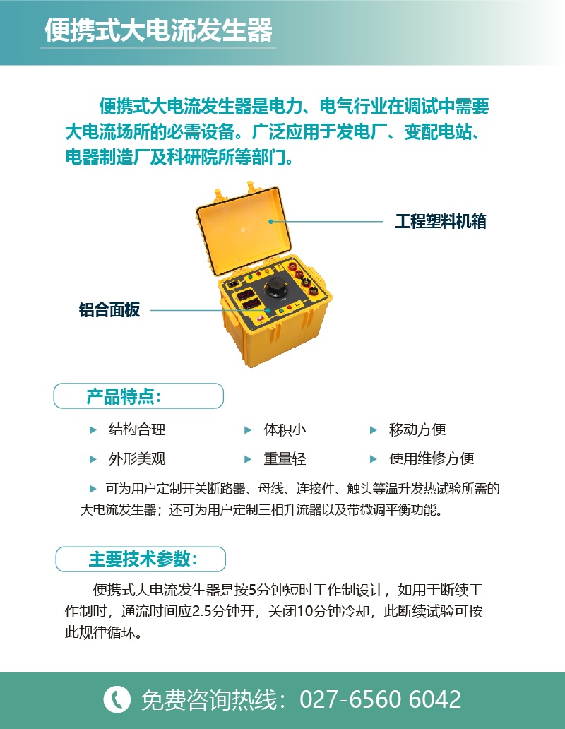CYSL-BX-100便攜式大電流發生器是電力、電氣行業在調試中需要大電流場所的必需設備,應用于發電廠、變配電站、電器制造廠及科研院所等部門,屬于短時或斷續工作制,具有體積小、重量輕、使用維修方便等特點。可為用戶定制開關斷路器、母線、連接件、觸頭等溫升發熱試驗所需的大電流發生器。還可為客戶定制三相升流器以及帶微調平衡功能。